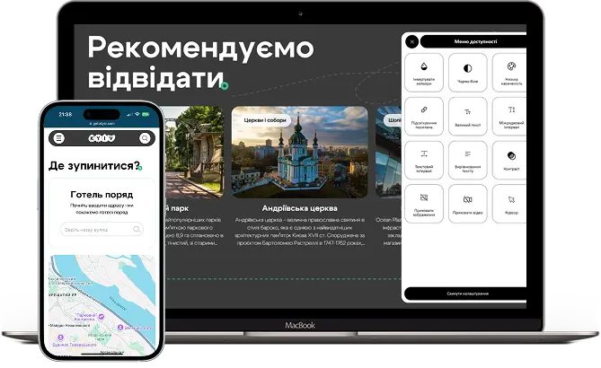 Головний екран платформи змінює візуальну концепцію залежно від часу доби та відображає автоматично оновлювані віджети погоди й курсу валют. Реалізовано інтерактивну карту готелів із можливістю визначення найближчих локацій за геопозицією користувача, а також магазин екскурсій із сегментацією за цільовими аудиторіями та функцією онлайн-покупки.